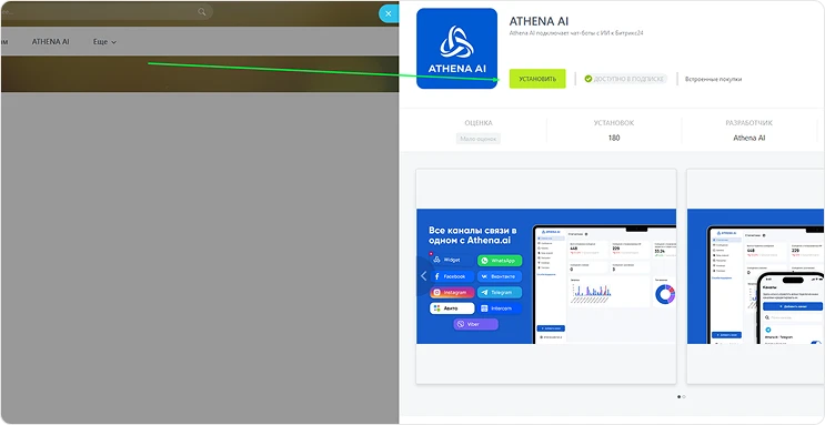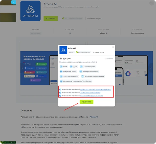 - Готово, открытая линия установлена, и Афина ИИ будет по умолчанию включаться в разговор в соответствии с настройками.Важно!Чат-бот будет работать только при условии наличия, и создания сделок со стороны Битрикс24.