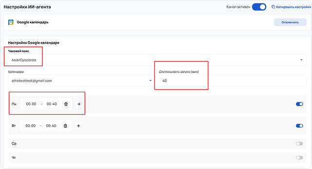 - Интеграция подключена, теперь необходимо задать часовой пояс, длительность встречи, и выбрать возможные промежутки записи в течении недели.
