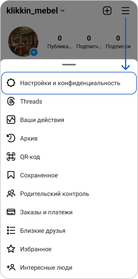 Зайдите в свой профиль и нажмите на кнопку меню. Выберите "Настройки и конфиденциальность"