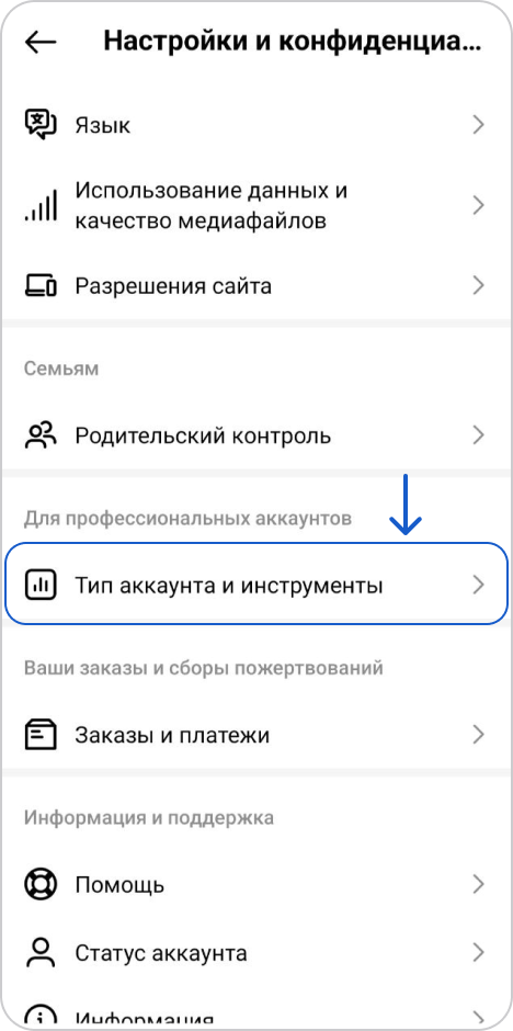 Промотайте вниз и нажмите "Тип аккаунта и инструменты"