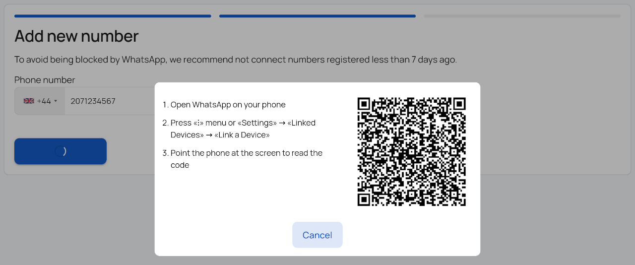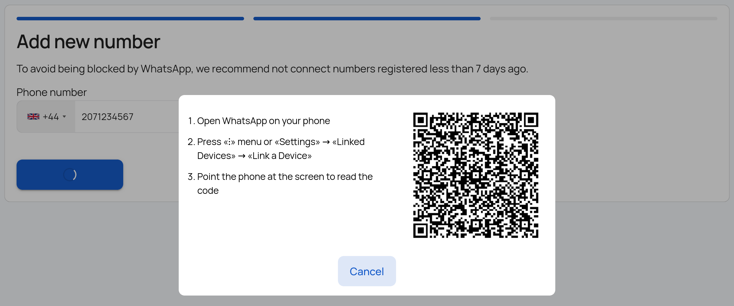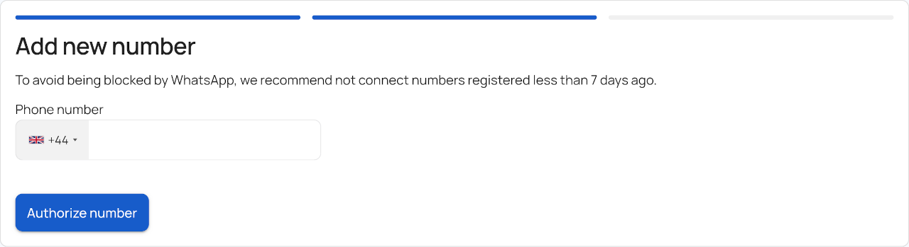 Для предотвращения блокировки со стороны WhatsApp, рекомендуется не использовать номера, зарегистрированные менее 7 дней назад. Также рекомендуется провести 10-15 активных диалогов с пользователями WhatsApp.